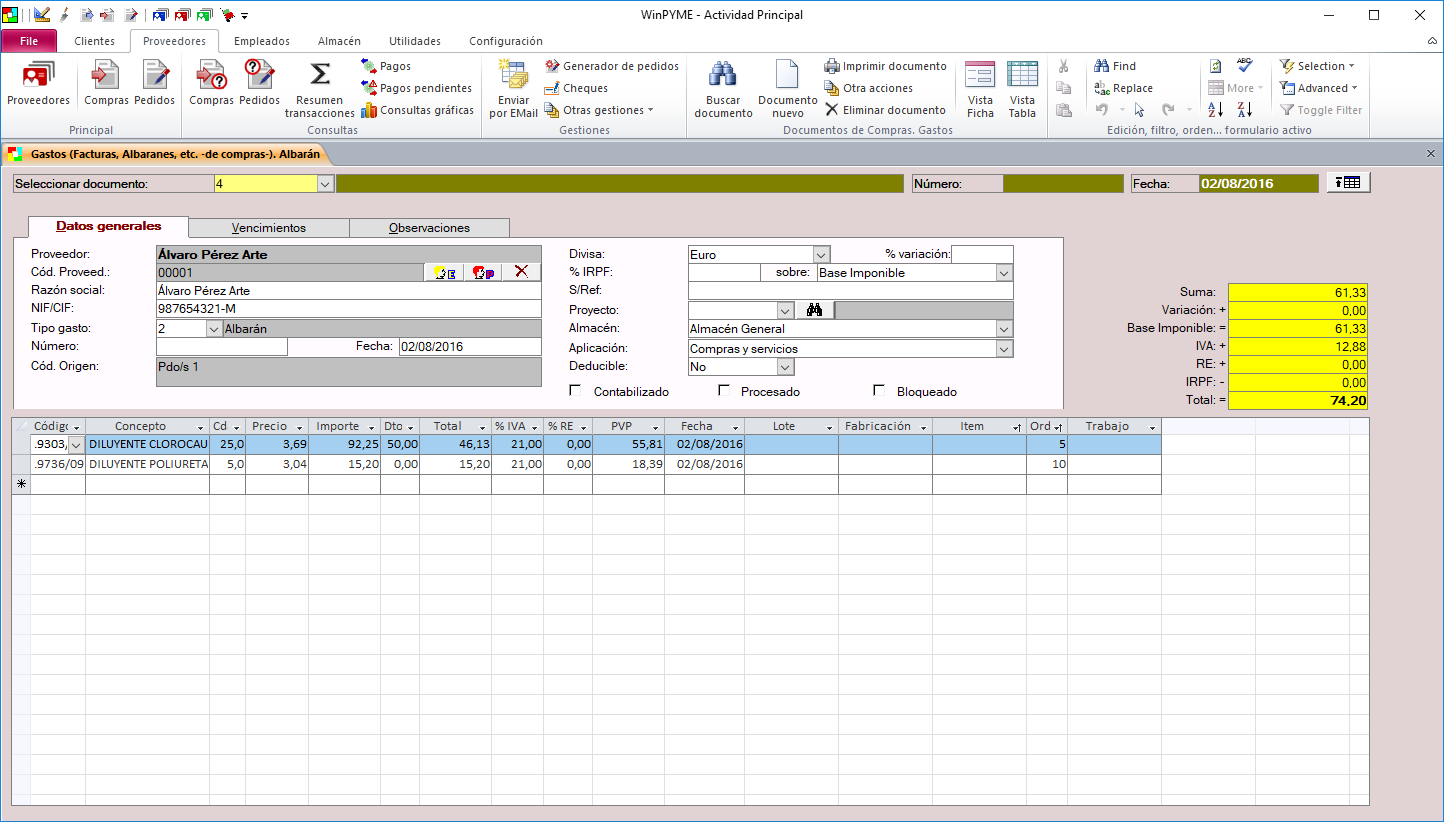 Puedes añadir, modificar o eliminar cuantas líneas de detalle desees (también en blanco), seleccionando el concepto de la lista de productos (a partir del nombre o del código) o añadiendo un texto independiente. Compras: