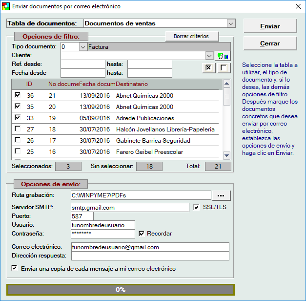 Una vez establecidas las opciones de envío (la primera vez que se usa es necesario hacerlo), sólo hay que marcar los documentos que se desean enviar.