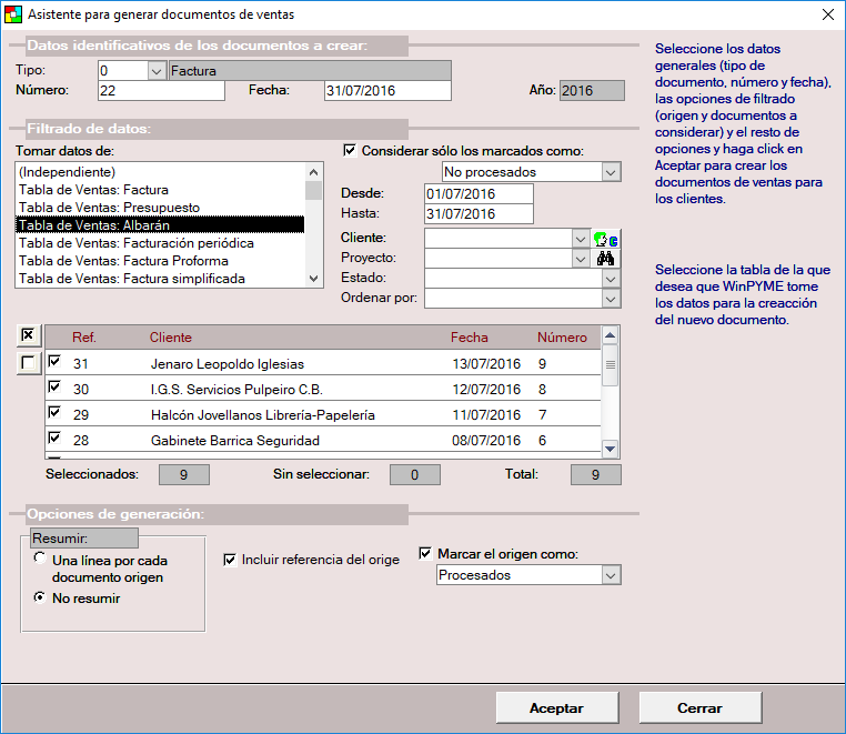 para hacer documentos de ventas: Se puede utilizar para, por ejemplo, facturar todos los albaranes emitidos durante el mes (o el tiempo que sea o los que, simplemente, estén pendientes de facturar).