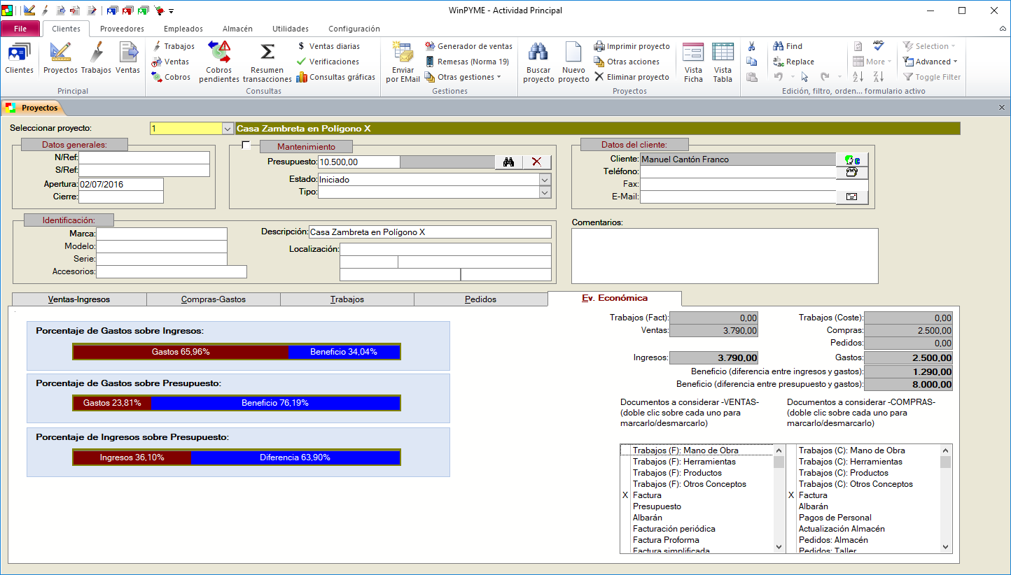 Tras abrir ficha a un proyecto, puede asignar al mismo trabajos, documentos de ventas, de compras y pedidos a proveedores. De esta forma puede controlar el volumen y la evolución económica a partir de los datos registrados.