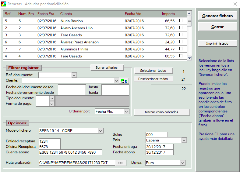 Generarlo es muy simple: Sólo hay que marcar los documentos de los que quiere emitir el correspondiente recibo y pulse el botón Generar fichero.