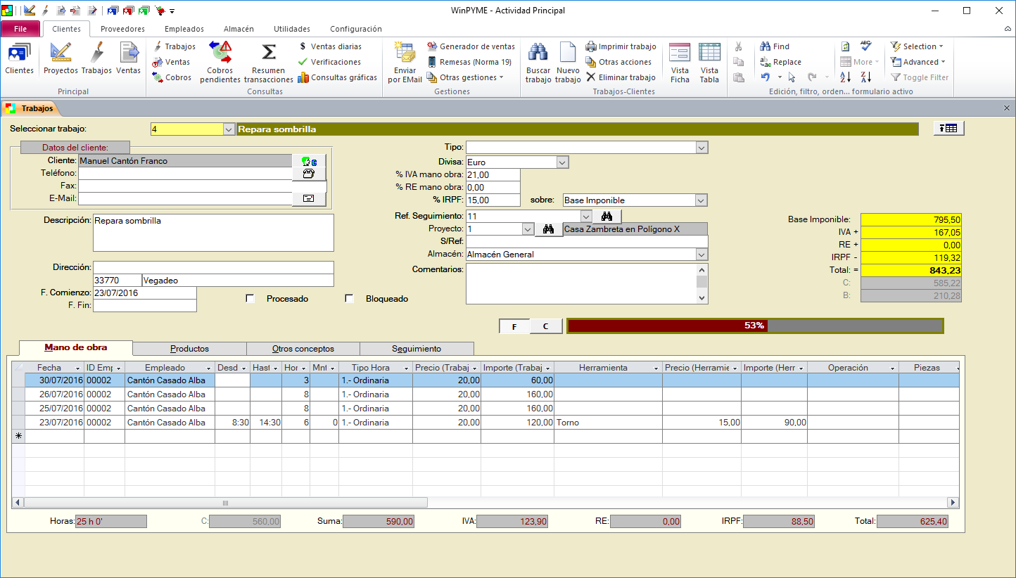En el módulo de trabajos se registran los tiempos empleados en la ejecución (con o sin herramienta), así como los materiales y otros conceptos (dietas, kilometraje, etc.). Con la evolución del mismo podrás tener una idea gráfica de la situación en base a un posible previo presupuesto. Al finalizar tendrás la oportunidad de generar la factura tomando como base los registros realizados en en el trabajo. Muy simple.