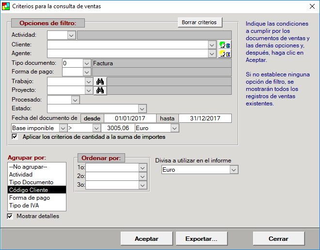 Desde este diálogo puede emitir un listado de documentos de ventas. Dispone de múltiples opciones de filtrado y agrupamiento.